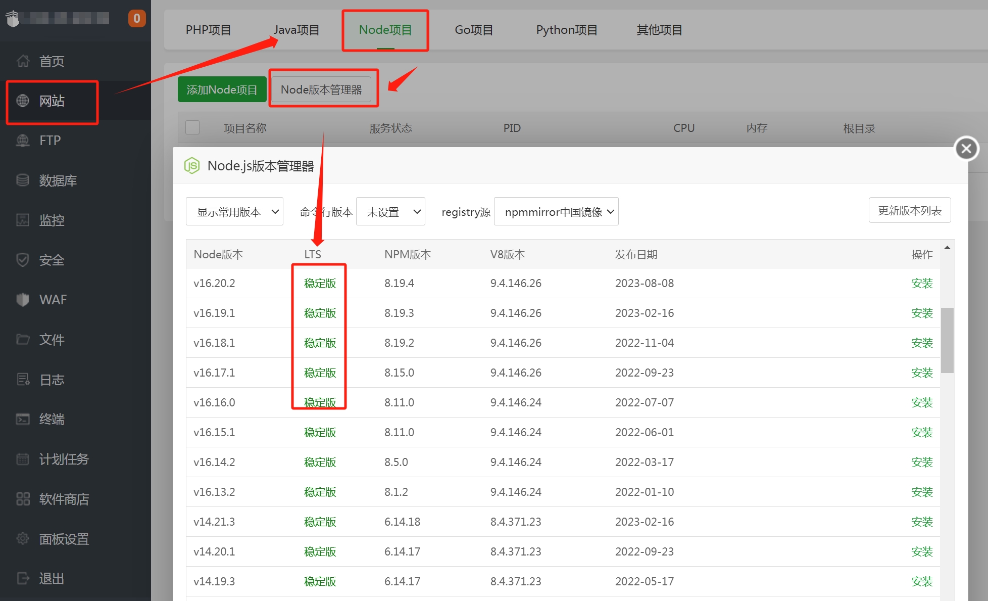 依次点击网站-Node项目-Node版本管理器,选择最后一个稳定版本安装